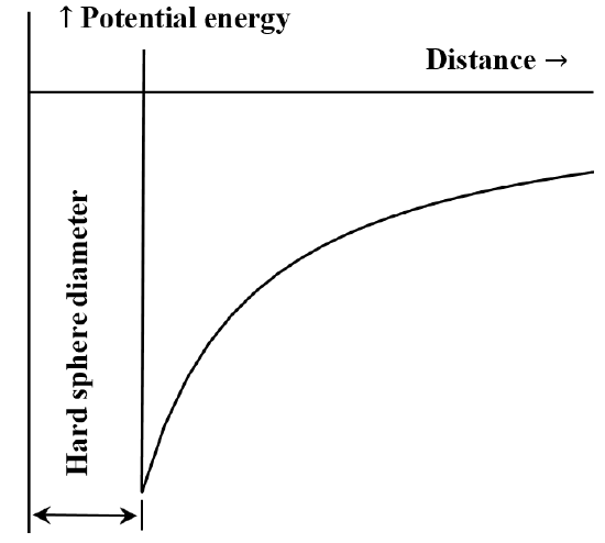 É frequentemente útil descrever a interacção entre partículas ou moieties químicas em termos de um diagrama de energia potencial versus distância. A equação de van der Waals corresponde ao caso de que a interação repulsiva entre moléculas é inexistente até que as moléculas entrem em contato. Uma vez que elas entram em contato, a energia necessária para movê-las ainda mais próximas umas das outras torna-se arbitrariamente grande. Muitas vezes isso é descrito dizendo que elas se comportam como “esferas duras”. A força de atracção entre duas moléculas diminui à medida que a distância entre elas aumenta. Quando elas estão muito distantes, a interação atrativa é muito pequena. Nós dizemos que a energia da interação é zero quando as moléculas estão infinitamente distantes. Se inicialmente tivermos duas moléculas amplamente separadas, estacionárias e mutuamente atraentes, elas se moverão espontaneamente em direção uma à outra, ganhando energia cinética à medida que se afastam. A sua energia potencial diminui à medida que se aproximam uma da outra, atingindo o seu menor valor quando as moléculas entram em contacto. Assim, a equação de van der Waals implica o diagrama de energia potencial versus distância esboçado na Figura 5.