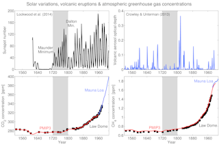 Maailma on kokenut pitkiä jäähtymisjaksoja, jotka ovat johtuneet useammin esiintyvistä räjähtävistä tulivuorenpurkauksista ja ajanjaksoista, jolloin auringonpilkkuja on ollut vähän – kuten ”pienen jääkauden” aikana, joka kesti suurin piirtein 1300-1800-luvuilla.