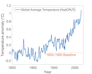Kuten alla olevasta kaaviosta käy ilmi, riippumatta siitä, mitä lähtökohtaa käytämme, on selvää, että maapallon lämpötila on noussut jyrkästi viime vuosisadan aikana.