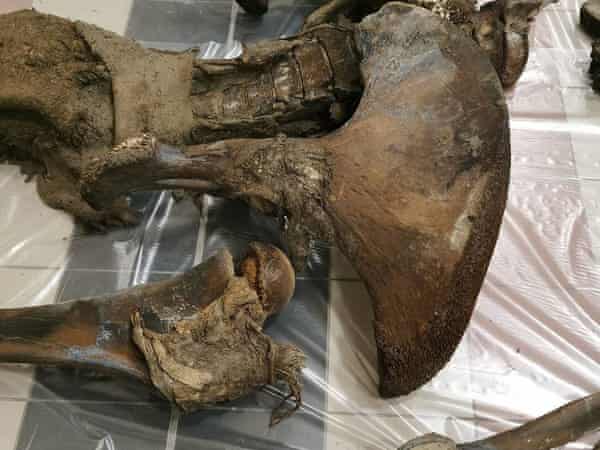 Les experts ont passé cinq jours à fouiller la vase du lac Pechenelava-To, dans la péninsule reculée de Yamal, pour retrouver les restes, qui comprennent des tendons, de la peau et même des excréments, après qu’ils aient été repérés par des résidents locaux. Environ 90% de l’animal a été récupéré au cours de deux expéditions.