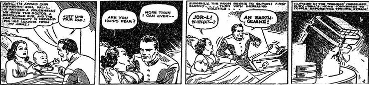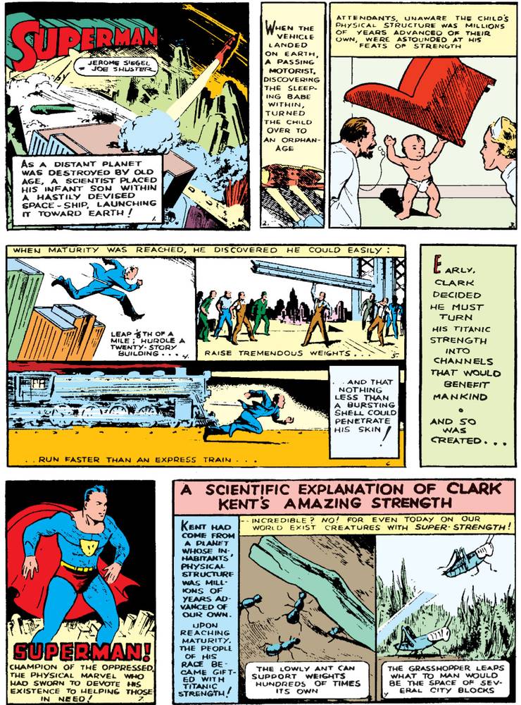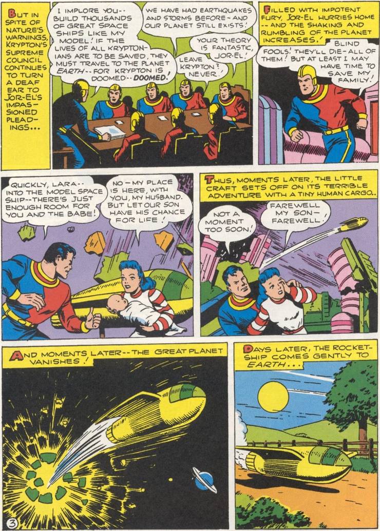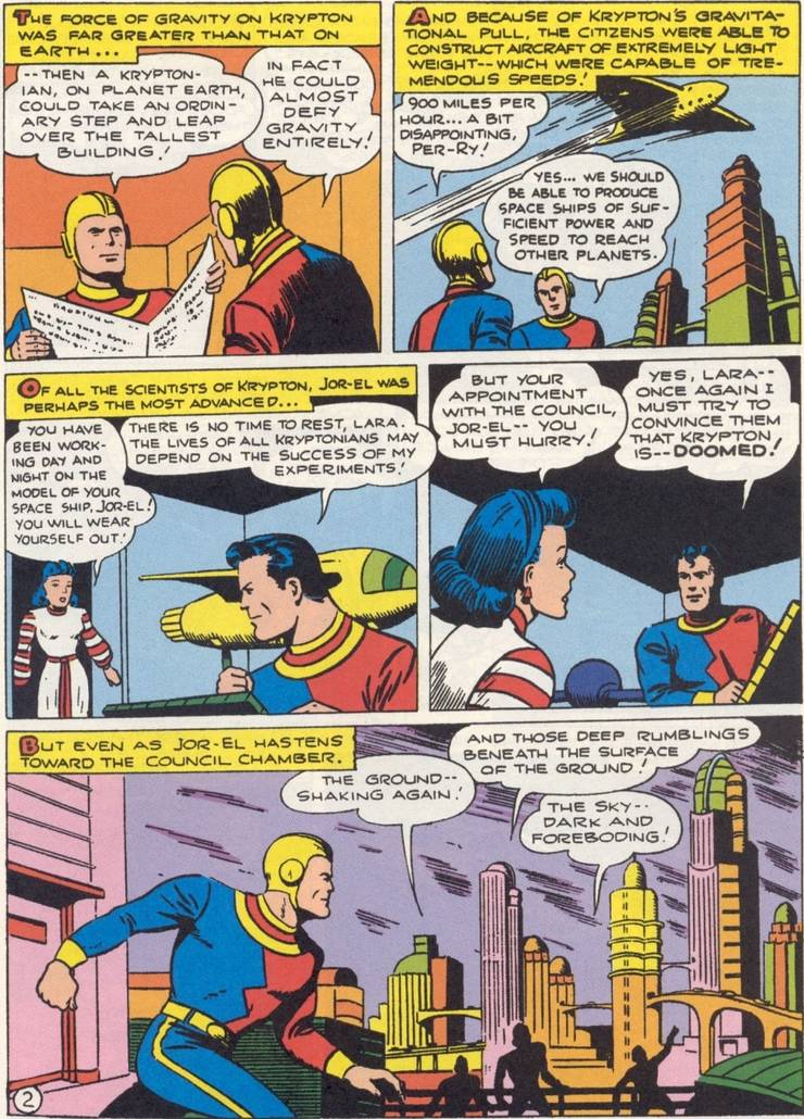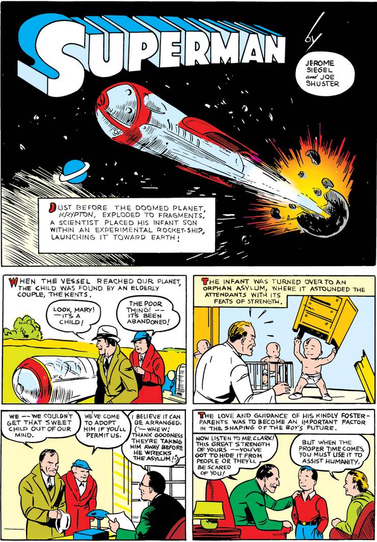 Plus tard cette année-là, Superman obtient sa propre série de comics continue en solo et Siegel et Shuster adaptent l’histoire d’origine dans Action Comics #1 et y ajoutent Krypton mais pas les autres aspects (comme les noms respectifs des personnages)….