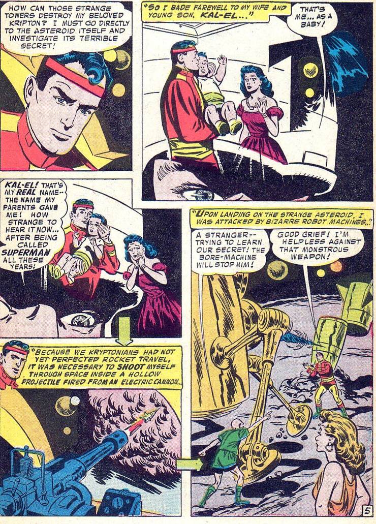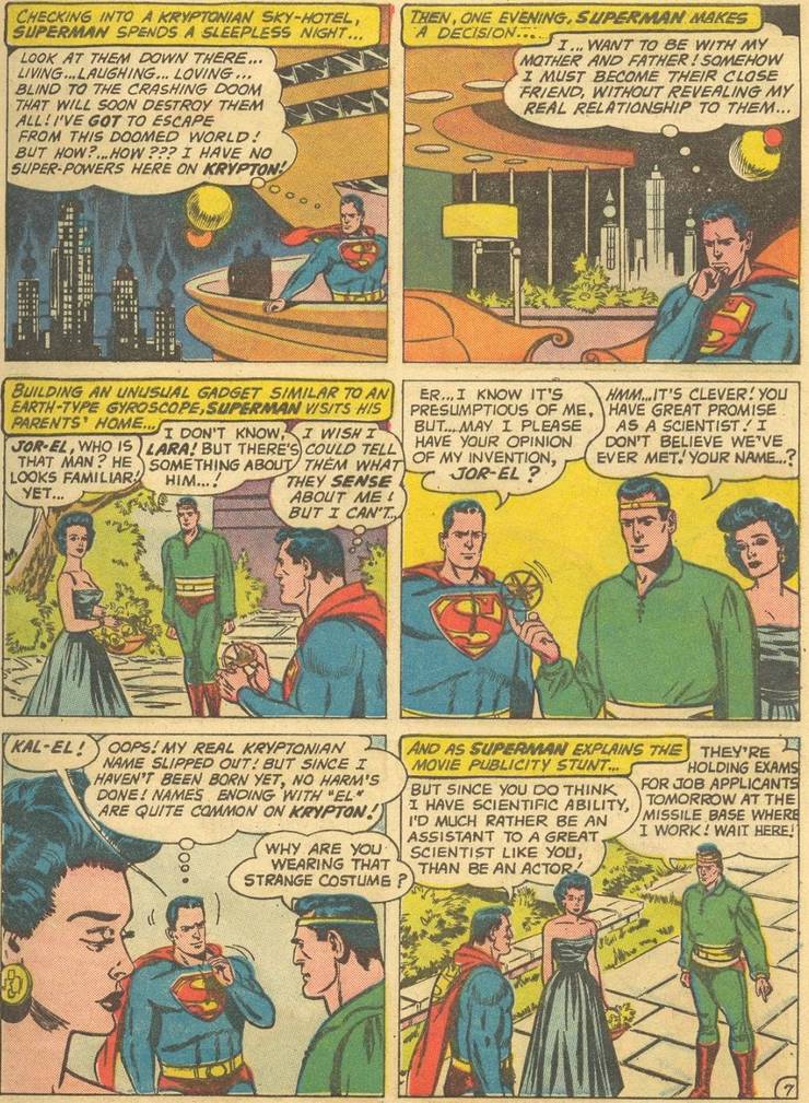 Kal-El, cependant, n’a pas vraiment été utilisé dans les comics avec régularité jusqu’à ce que Jerry Siegel revienne aux comics Superman à la fin des années 1950, comme ce passage « Return to Krypton » dans Superman #141…