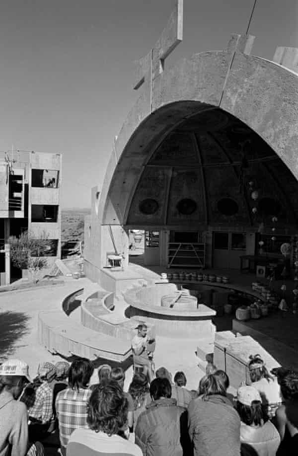 En 1969, Soleri a publié Arcology : The City In The Image Of Man, un tome noir de plus d’un mètre de large, qui exposait sa philosophie dans une prose dense et des dessins complexes de prototypes d' »arcologies » : des mégapoles adaptées à différents habitats, des canyons aux marais en passant par les volcans. On peut dire qu’ils sont plus proches de la fantaisie psychédélique que de propositions architecturales sérieuses, mais Soleri ne plaisante pas. Stimulé par sa nouvelle célébrité et sa richesse, il a acquis une parcelle de désert et, en 1970, la construction d’Arcosanti a commencé.