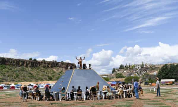 Mon retour à Arcosanti l’année dernière a coïncidé avec Convergence – un festival de trois jours de « contre-culture, de cocréation, d’art et de musique », qui en est à sa troisième année. En contraste avec les valeurs de « vieil homme » de Soleri, l’ambiance est un mélange de steampunk, d’éco-hippie et de Burning Man. Des conférences et des ateliers sur l’inclusion, la justice raciale, la réalisation de soi et la durabilité sont proposés, ainsi que de la musique en direct et de la poésie hip-hop. La foule est visiblement jeune et diversifiée. Un visiteur me dit qu’il a trouvé Arcosanti sur Instagram. Il y a une cérémonie du soir avec un flûtiste amérindien qui joue alors que la pleine lune rouge se lève. Peu de gens semblent connaître Paolo Soleri et presque personne n’est au courant des allégations d’abus. La seule mention de Soleri a lieu lors d’une table ronde sur l’avenir d’Arcosanti, où un vétéran le décrit comme « un dictateur bienveillant ».