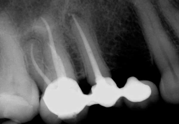 Certaines radiolucences périapicales (PARL) (figure 4) peuvent durer jusqu’à cinq ans après le traitement de canal. Un facteur qui contribue à la présence prolongée des PARL est la taille de la lésion initiale, de sorte que les lésions plus grandes ont tendance à durer plus longtemps et à guérir à un rythme plus lent. La localisation de la lésion est un autre facteur qui peut contribuer à cette guérison prolongée. Les lésions situées dans un os plus dense, comme la mandibule antérieure, ont tendance à guérir plus lentement que les lésions situées dans un os moins cortical, comme le maxillaire postérieur. Les antécédents médicaux du patient sont un autre facteur à prendre en considération dans de tels cas. Des études montrent que les patients diabétiques, en raison de la baisse de la fonction de leur système immunitaire, peuvent avoir besoin de plus de temps pour guérir. Certains des PAP qui ont tendance à durer peuvent également être des tissus cicatriciels dans l’os.