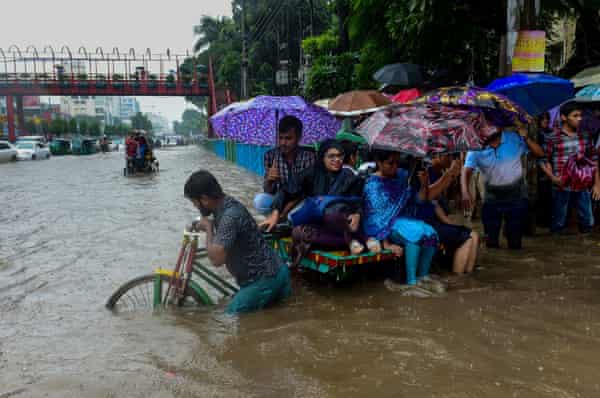 Durante l’incessante stagione dei monsoni in Bangladesh, Dhaka viene sommersa diverse volte al mese. Gli scarichi sovraccarichi si intasano e la città bassa si riempie d’acqua come una vasca da bagno. Giornali come il Dhaka Tribune lamentano l’inondazione con foto di autobus allagati e citazioni di pendolari irritati e di esperti urbani sconfortati: “Dhaka di nuovo sott’acqua”; “È la stessa vecchia storia”