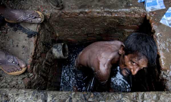 Ai lati delle strade, sotto la pioggia accecante, l’esercito straccione dei pulitori di fogne si mette al lavoro. Alcuni infilano bastoncini di bambù nei tombini. Altri sono immersi, seminudi, nella sporcizia liquida e costretti a raccogliere il fango a mani nude. “Il peggior lavoro del mondo”, hanno dichiarato i media mondiali l’anno scorso, dopo che le foto dei lavoratori immersi fino al collo nei rifiuti sono diventate virali.