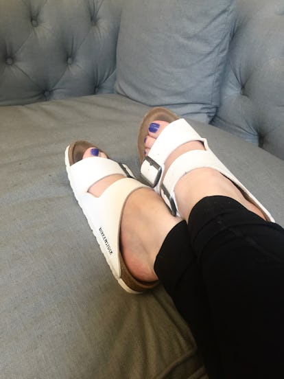 初日、とても新鮮できれいな状態からスタートしました。 昨年の夏、初めて履いた靴の慣らし運転で中々のトラウマになったので、少しずつでも真剣に取り組む必要があると思ったからです。 というのも、昨年の夏、初めて履いたサンダルの慣らし運転で、ちょっとしたトラウマがあったからです。 しかし、2回目に履いたときは、セントラルパークを歩いたり、買い物をしたりと長い1日で、足全体に水ぶくれができ、1週間以上、正当なかさぶたができたのです。
