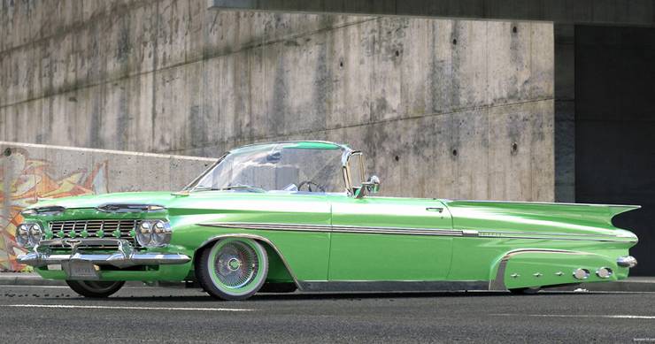 În cel mai deschis verde metalizat colorat posibil, această Impala din 1959 cu hardtop din a doua generație arată uimitor și emană o strălucire pe care puțini o pot suporta fără o protecție adecvată pentru ochi. Accentele cromate adaugă și mai multă splendoare mașinii, iar sistemul său hidraulic are grijă să o protejeze în timp ce o lasă să meargă cât mai aproape de sol.