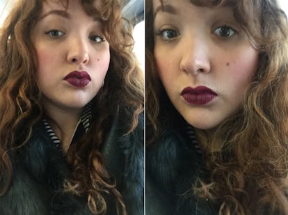 În poza din stânga, mă răcoresc în interiorul hainei mele, astfel încât să nu puteți vedea cât de grasă este fața mea. O buză pufoasă tinde, de asemenea, să îți subțieze obrajii. Poate un alt motiv pentru care atât de multe modele de pe podiumuri fac pufuleți…